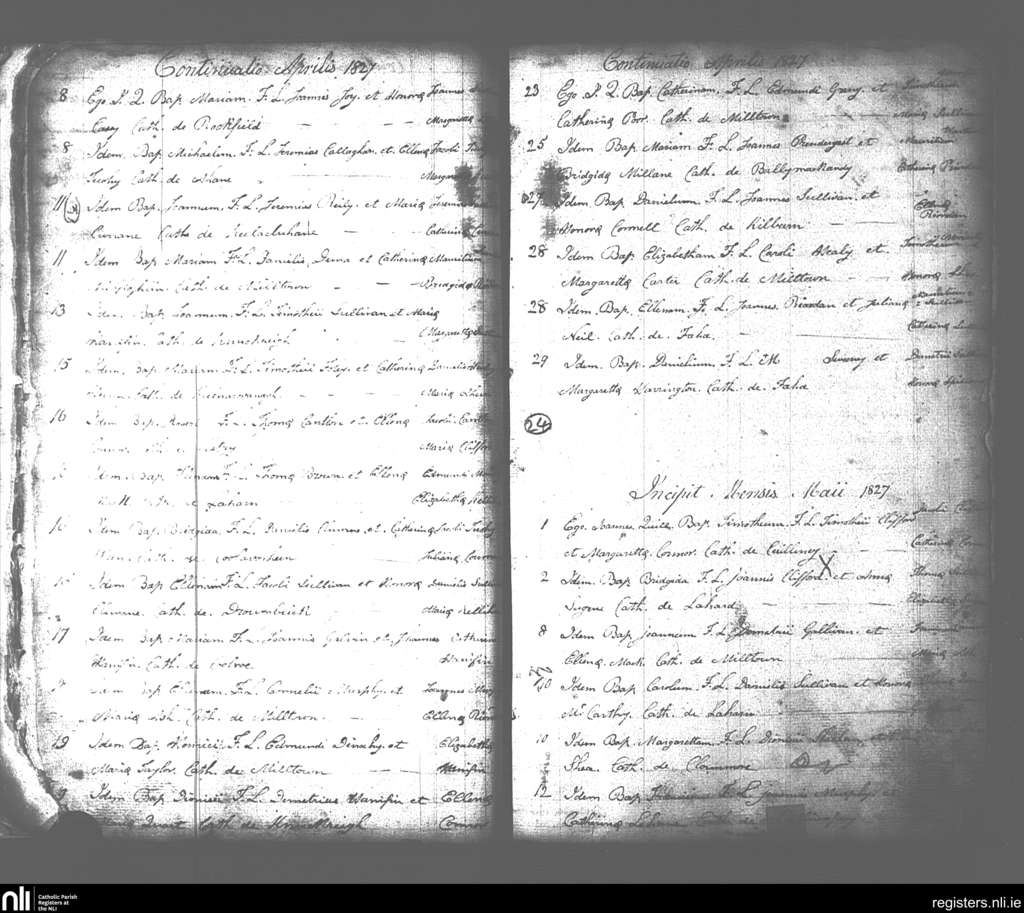 Milltown; County of Kerry; Diocese of Kerry. Baptisms, Apr. 1827 to May 1827