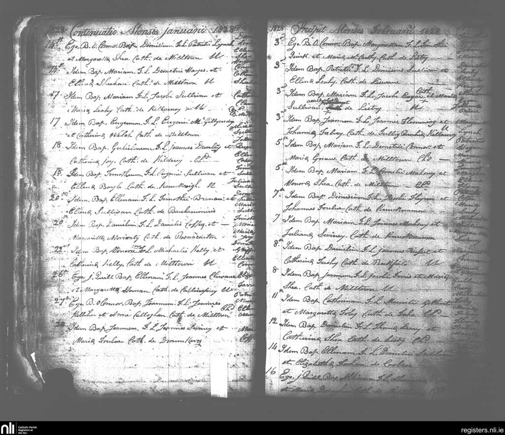 Milltown; County of Kerry; Diocese of Kerry. Baptisms, Jan. 1828 to Feb. 1828