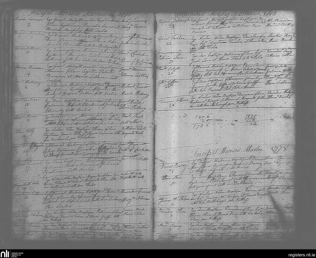Tralee; County of Kerry; Diocese of Kerry. Baptisms, Feb. 1778 to Mar. 1778