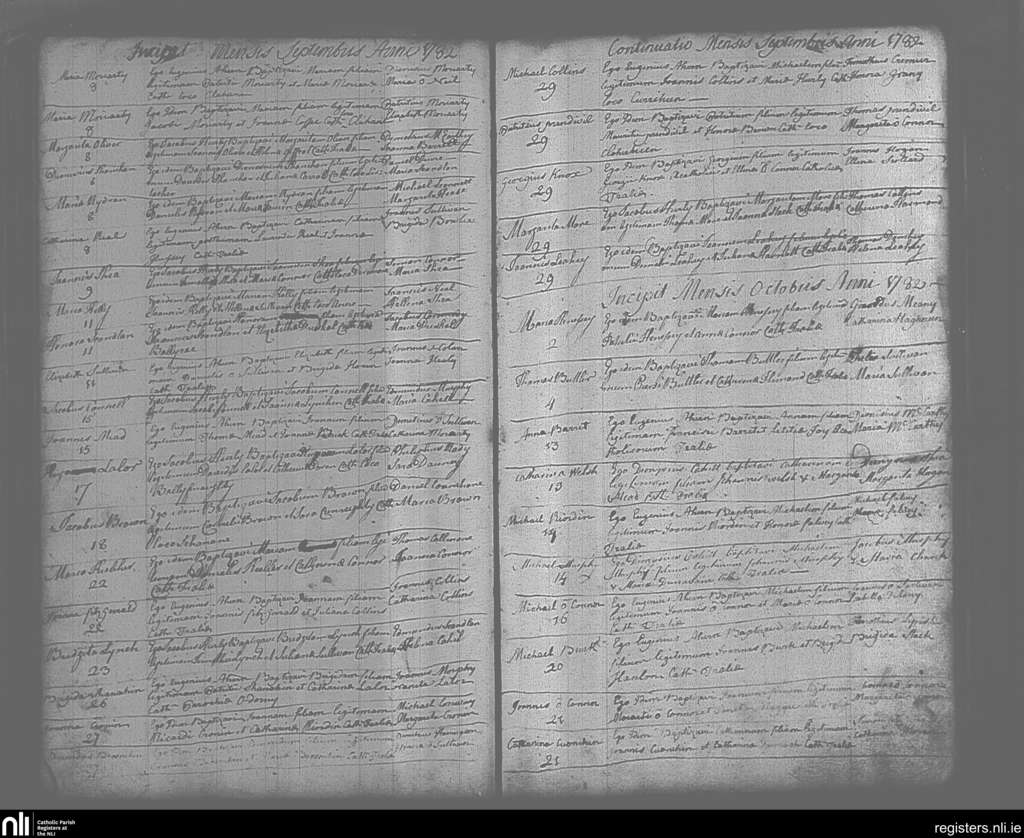 Tralee; County of Kerry; Diocese of Kerry. Baptisms, Sep. 1782 to Oct. 1782