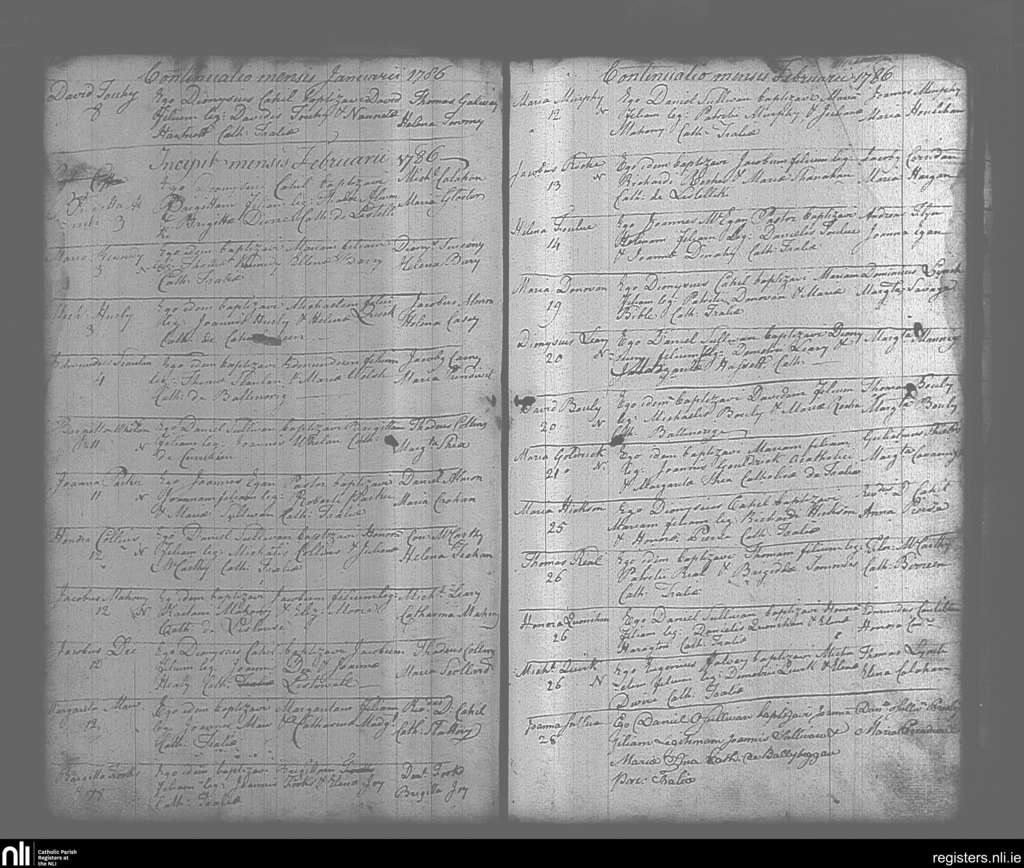Tralee; County of Kerry; Diocese of Kerry. Baptisms, Jan. 1786 to Feb. 1786