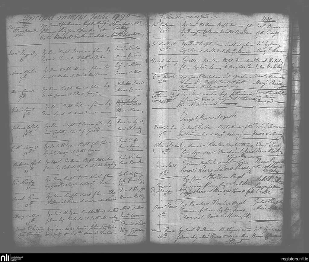 Tralee; County of Kerry; Diocese of Kerry. Baptisms, July 1790 to Aug. 1790