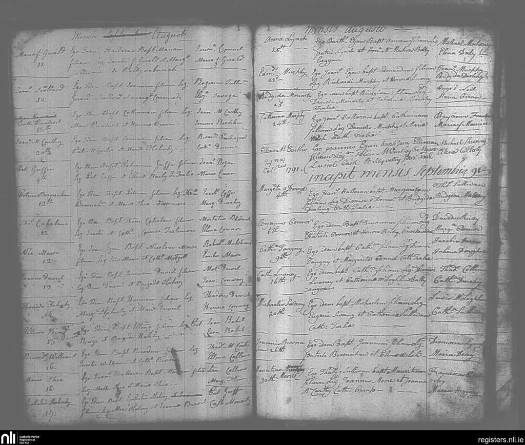 Tralee; County of Kerry; Diocese of Kerry. Baptisms, Aug. 1791 to Sep. 1791