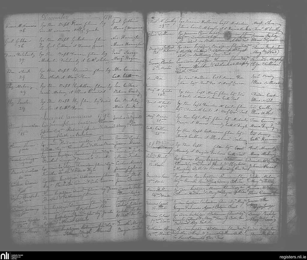 Tralee; County of Kerry; Diocese of Kerry. Baptisms, Dec. 1791 to Mar. 1792