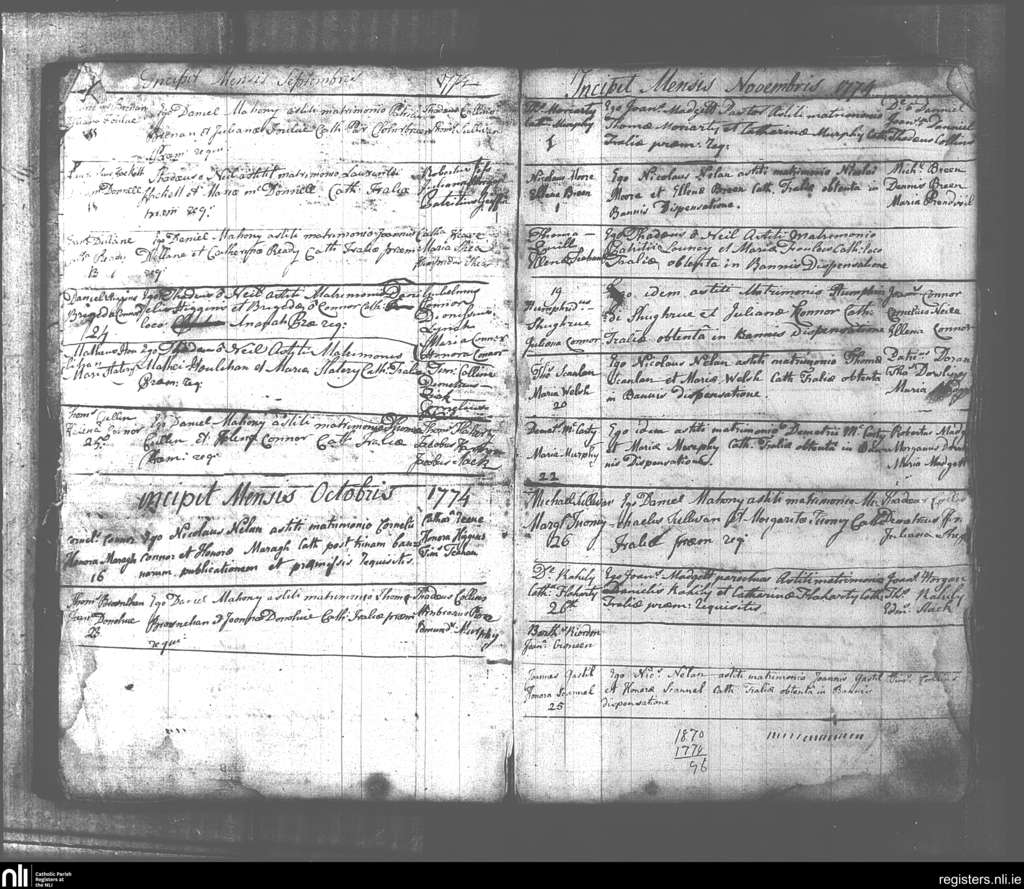 Tralee; County of Kerry; Diocese of Kerry. Marriages, Sep. 1774 to Nov. 1774