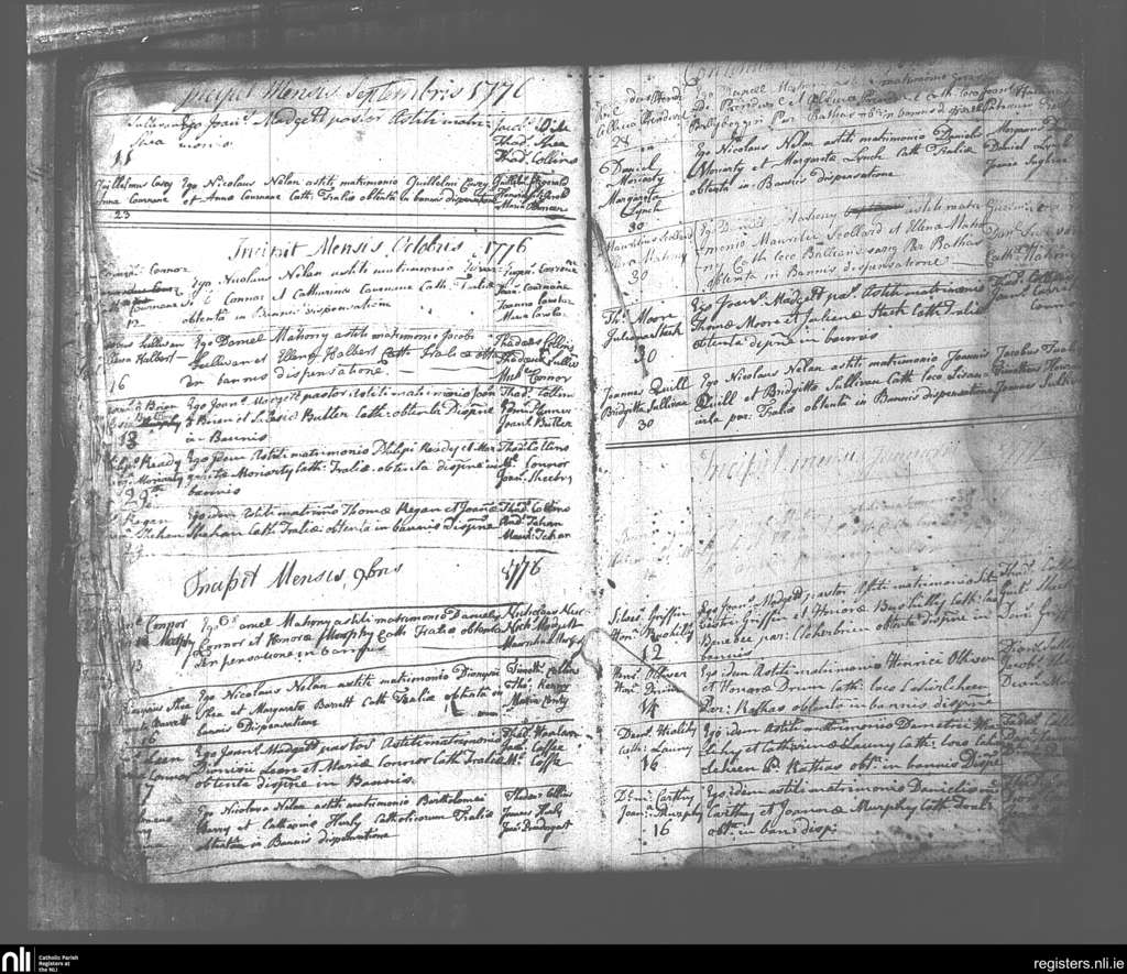 Tralee; County of Kerry; Diocese of Kerry. Marriages, Sep. 1776 to Jan. 1777