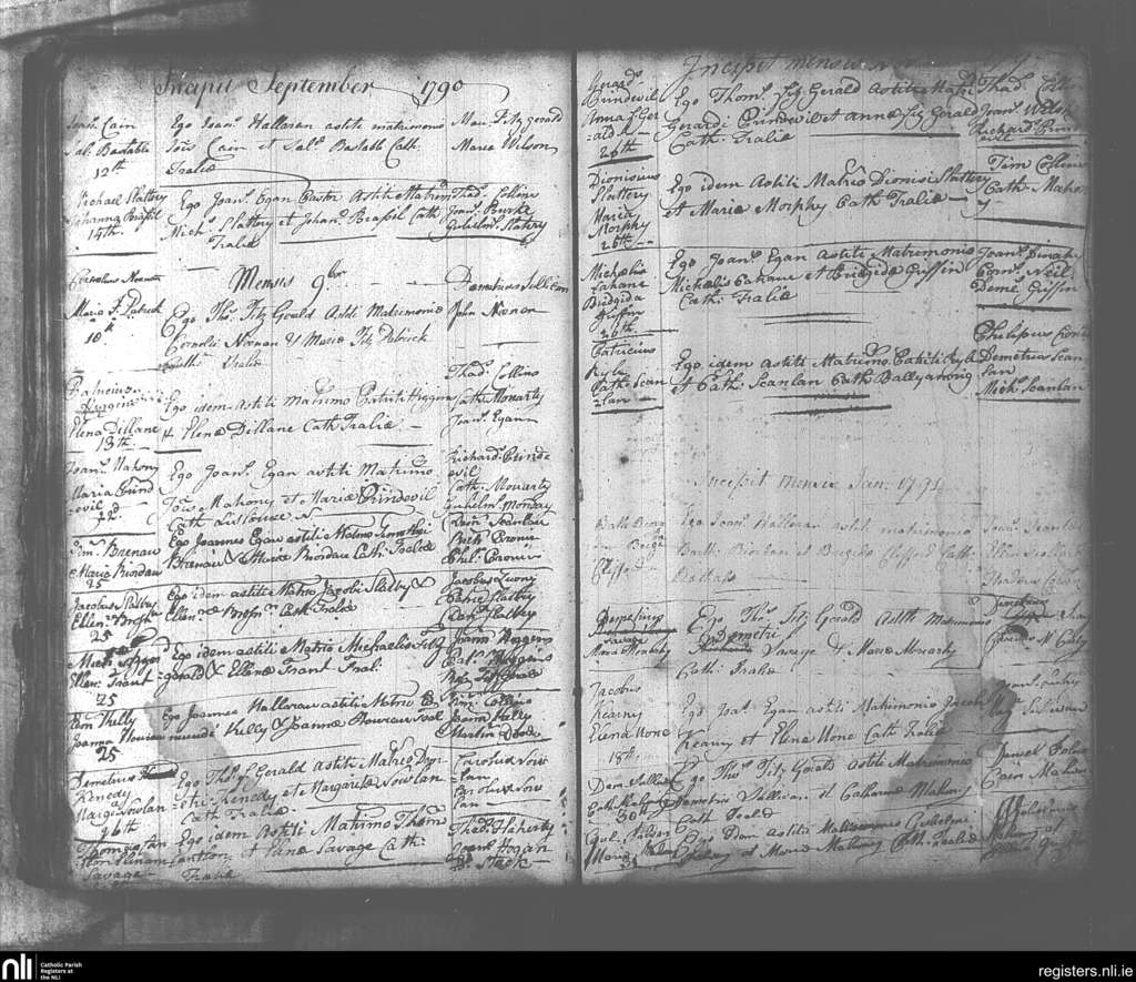 Tralee; County of Kerry; Diocese of Kerry. Marriages, Sep. 1790 to Jan. 1791