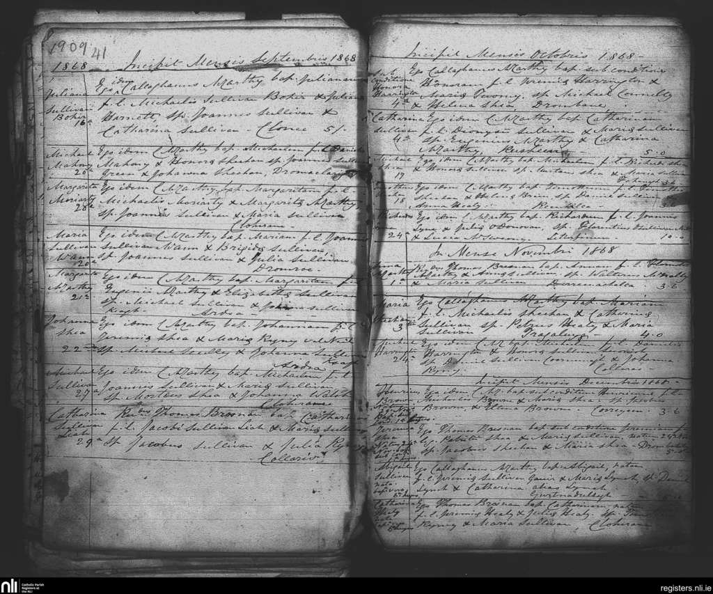 Tuosist; County of Kerry; Diocese of Kerry. Baptisms, Sep. 1868 to Dec. 1868