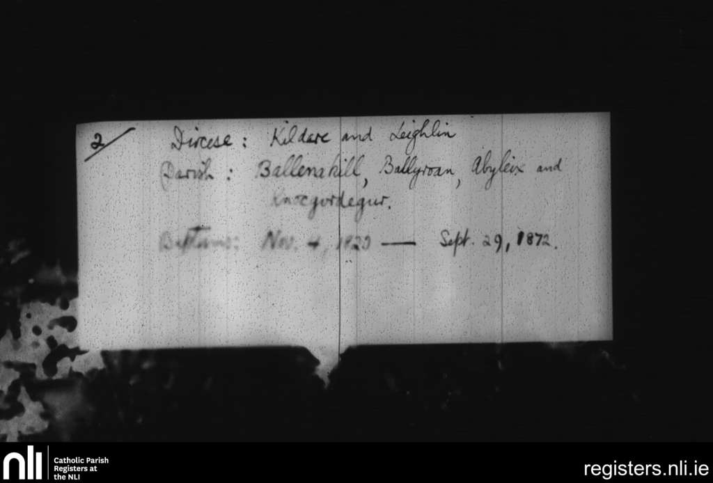 Abbeyleix and Ballyroan; County of Kilkenny, Laois; Diocese of Kildare and Leighlin. Baptisms