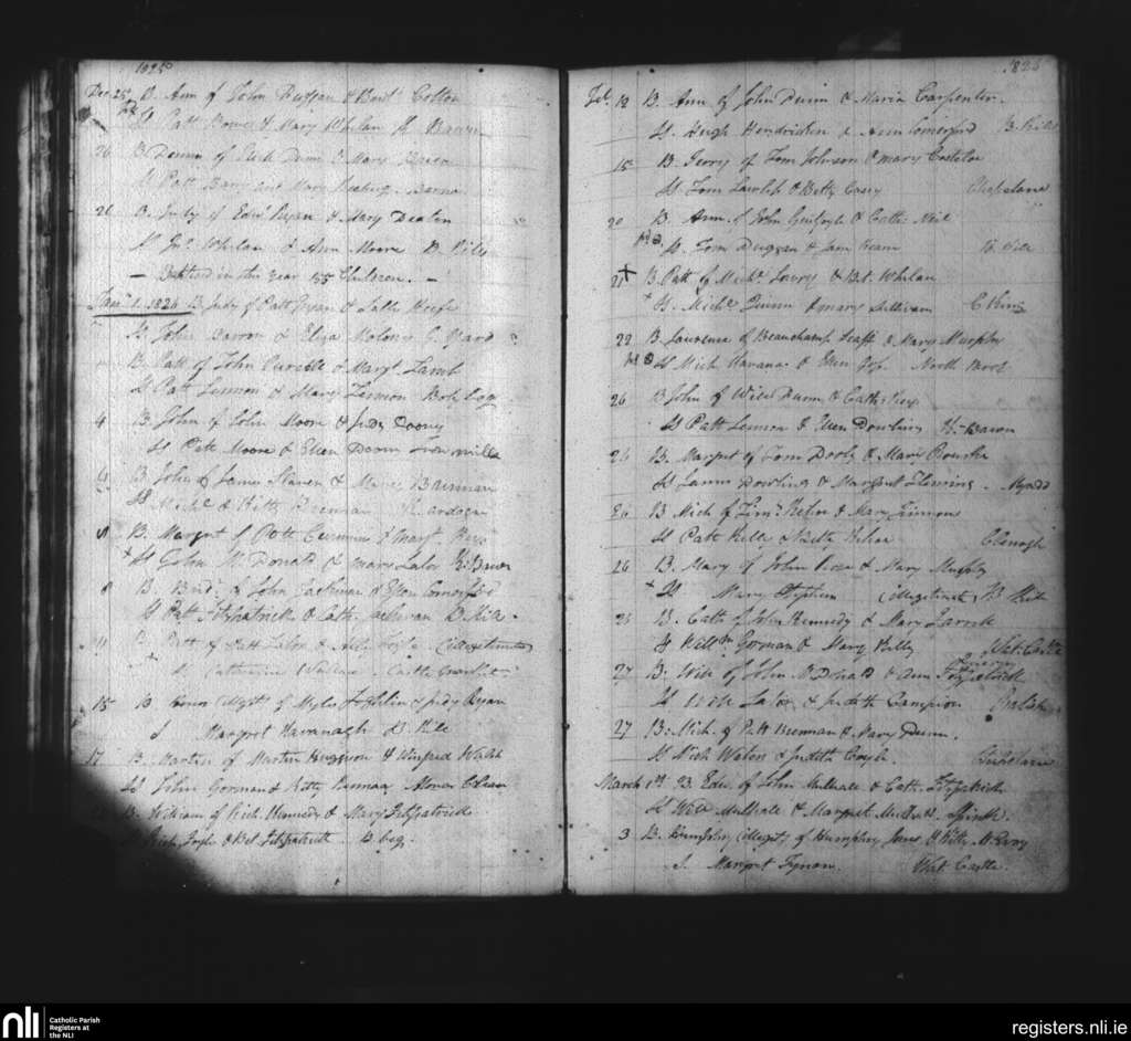 Abbeyleix and Ballyroan; County of Kilkenny, Laois; Diocese of Kildare and Leighlin. Baptisms, Dec. 1825 to Mar. 1826