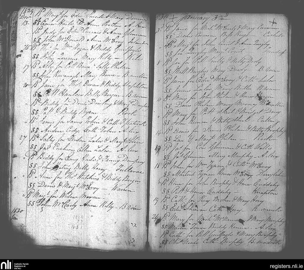 Abbeyleix and Ballyroan; County of Laois, Kilkenny; Diocese of Kildare and Leighlin. Baptisms, Dec. 1829 to Jan. 1830