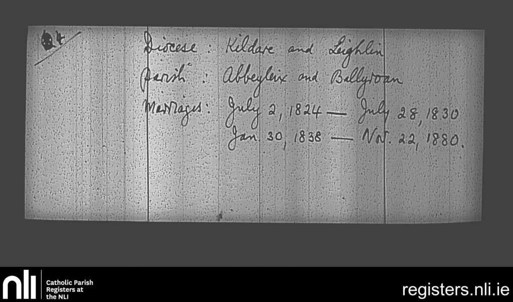Abbeyleix and Ballyroan; County of Laois, Kilkenny; Diocese of Kildare and Leighlin. Marriages