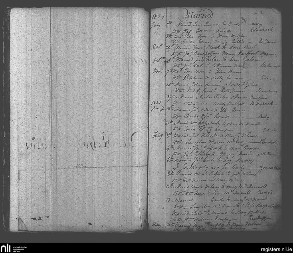 Abbeyleix and Ballyroan; County of Laois, Kilkenny; Diocese of Kildare and Leighlin. Marriages, July 1824 to May 1825