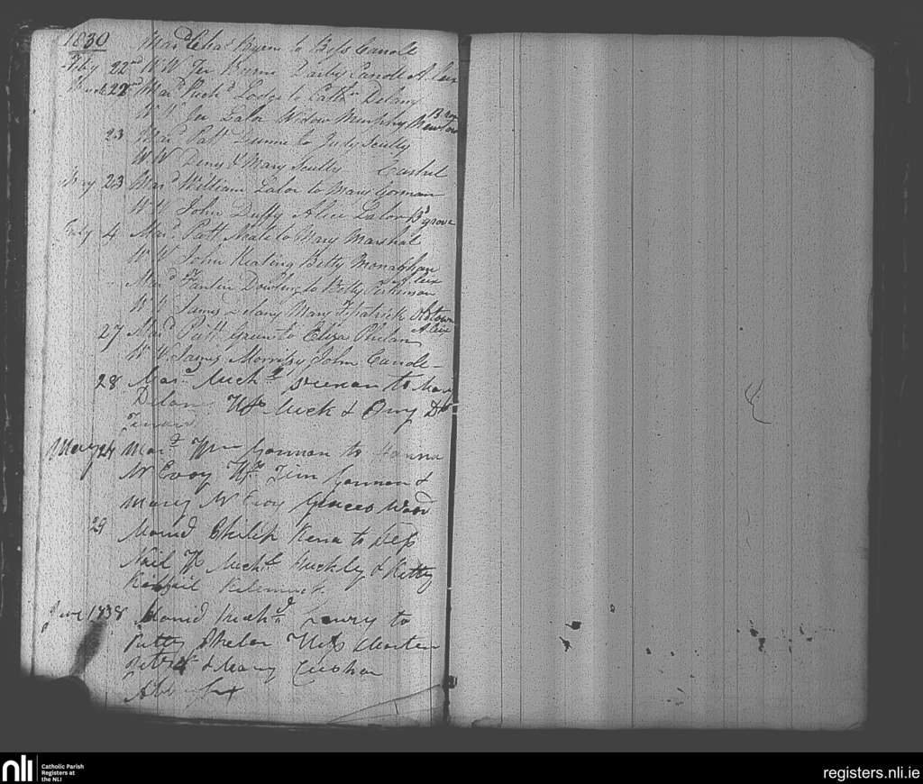 Abbeyleix and Ballyroan; County of Laois, Kilkenny; Diocese of Kildare and Leighlin. Marriages, Feb. 1830 to July 1830