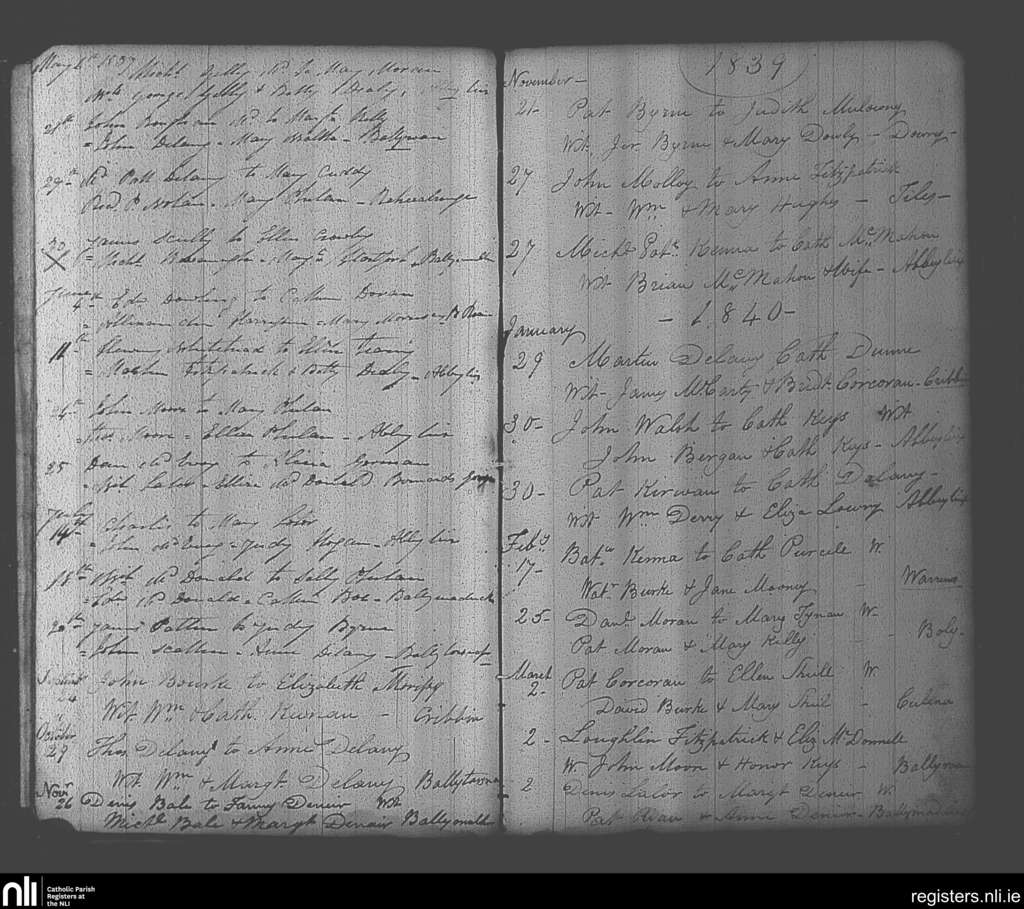 Abbeyleix and Ballyroan; County of Laois, Kilkenny; Diocese of Kildare and Leighlin. Marriages, May 1839 to Mar. 1840