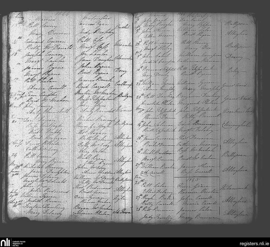 Abbeyleix and Ballyroan; County of Laois, Kilkenny; Diocese of Kildare and Leighlin. Marriages, Feb. 1844 to Jan. 1845