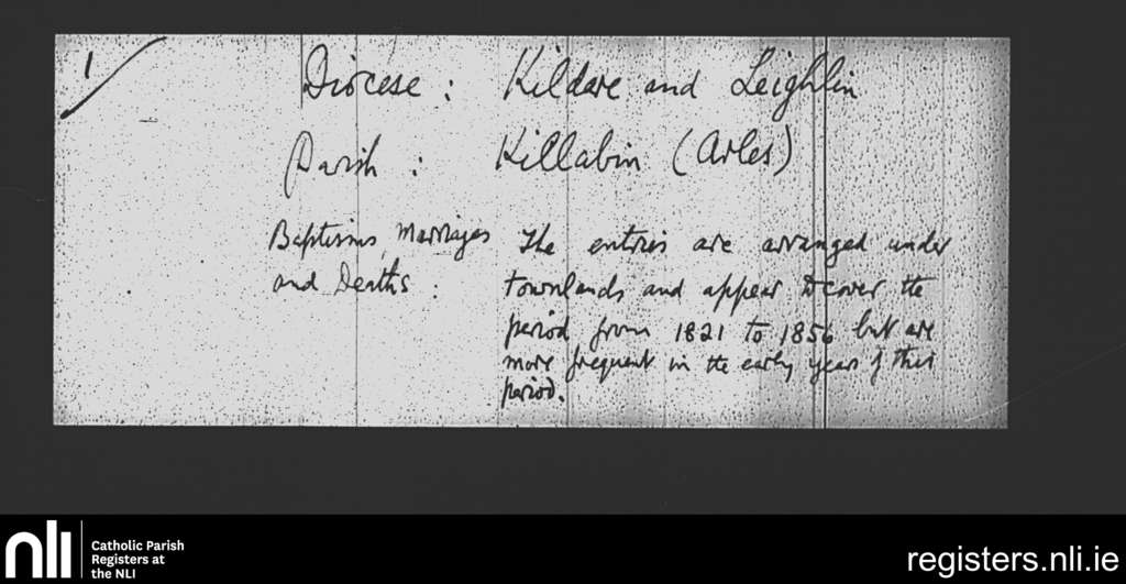Arles; County of Laois; Diocese of Kildare and Leighlin. Baptisms, Marriages, Deaths
