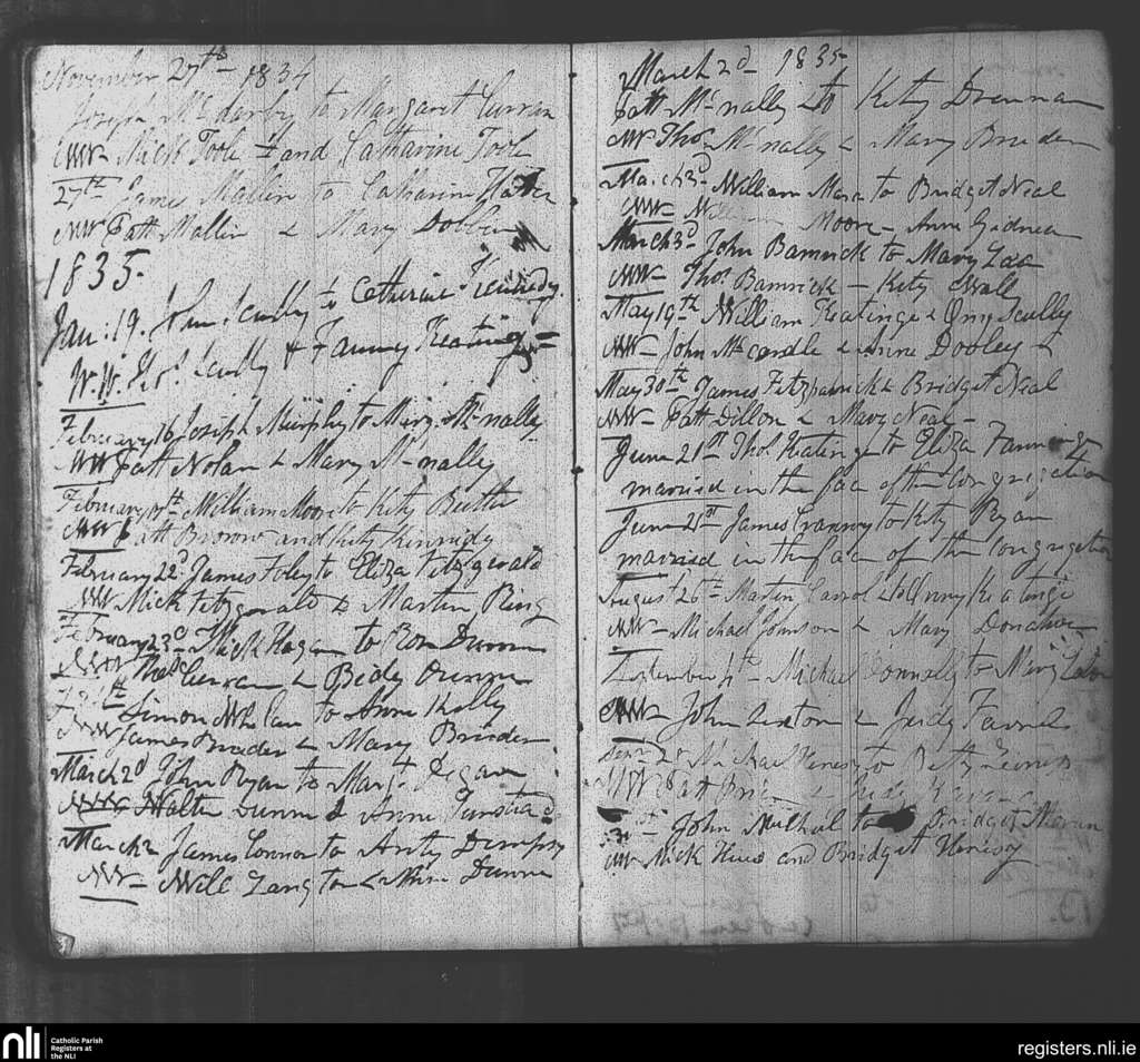 Arles; County of Laois; Diocese of Kildare and Leighlin. Marriages, Nov. 1834 to Sep. 1835