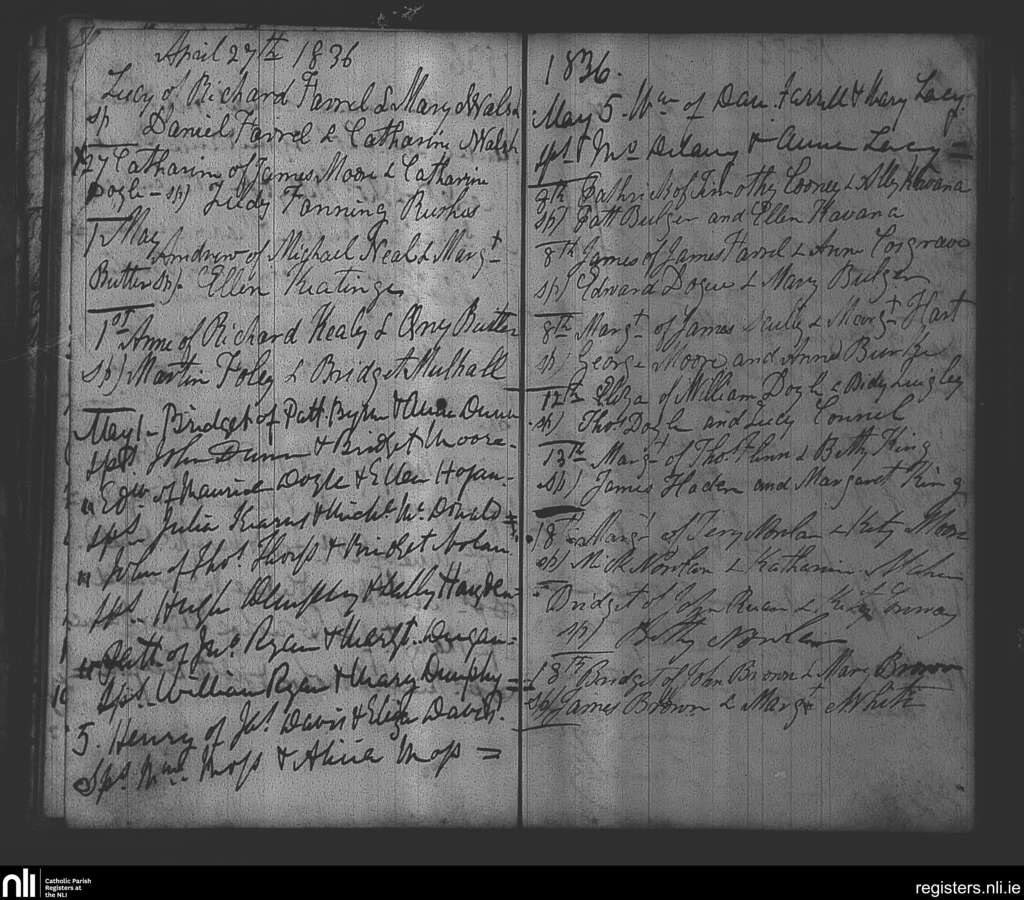 Arles; County of Laois; Diocese of Kildare and Leighlin. Baptisms, Apr. 1836 to May 1836