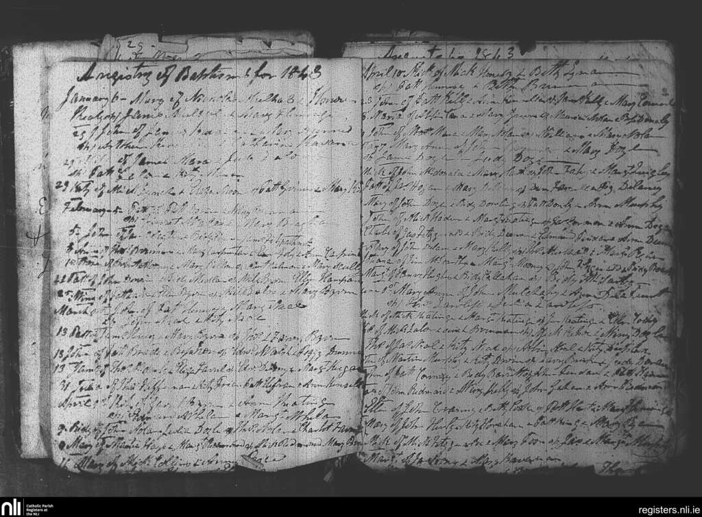 Arles; County of Laois; Diocese of Kildare and Leighlin. Baptisms, Jan. 1843 to June 1843