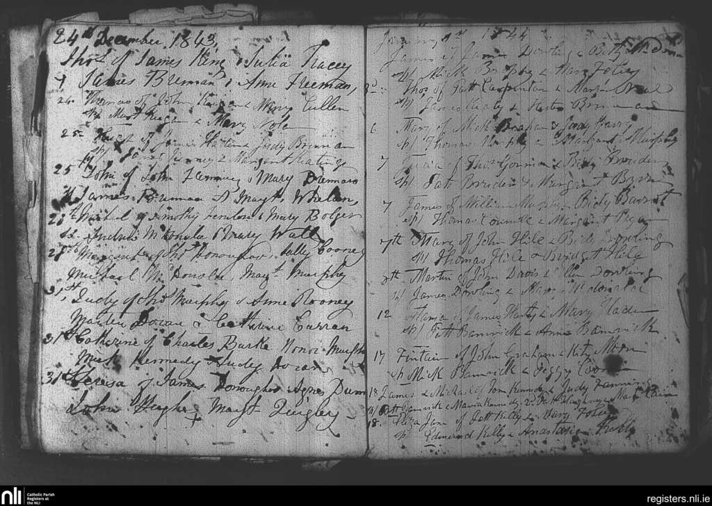 Arles; County of Laois; Diocese of Kildare and Leighlin. Baptisms, Dec. 1843 to Jan. 1844