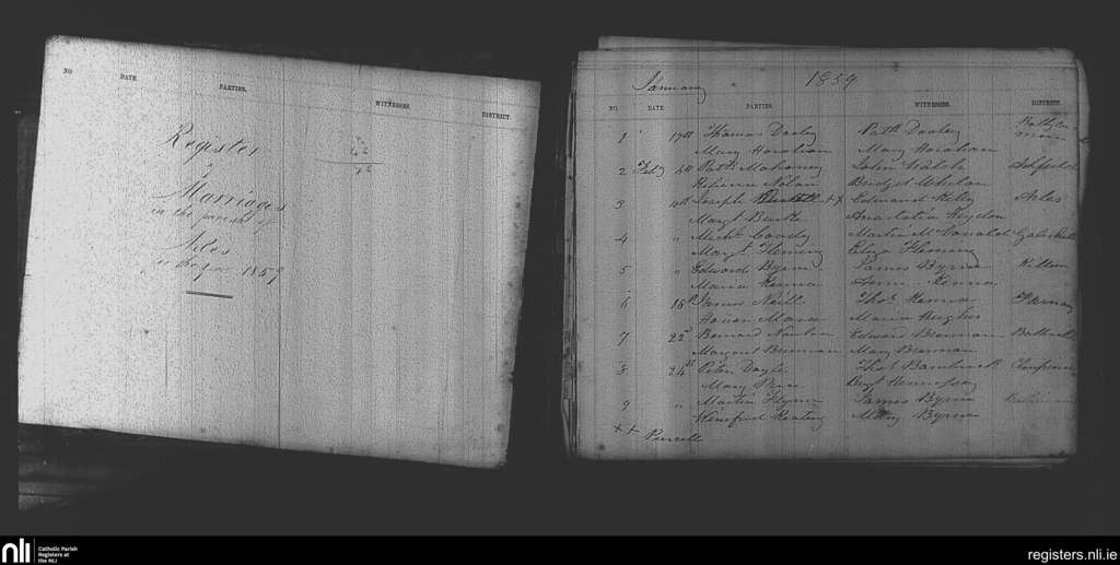 Arles; County of Laois; Diocese of Kildare and Leighlin. Marriages, Jan. 1859 to Feb. 1859