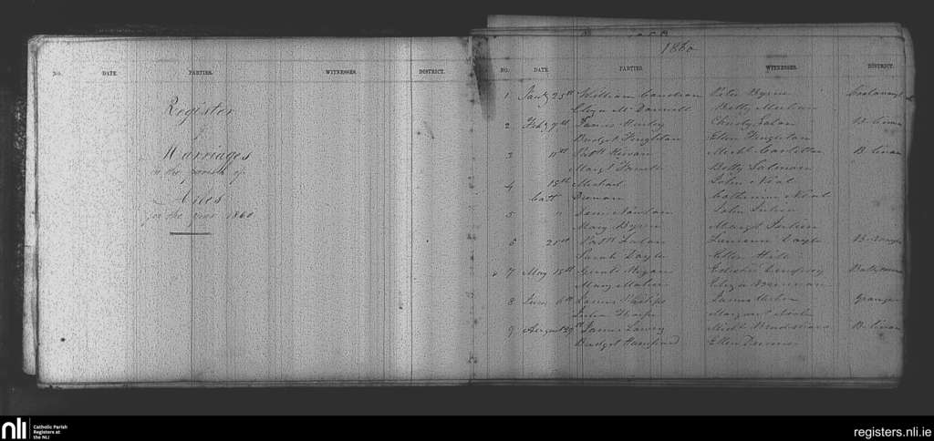 Arles; County of Laois; Diocese of Kildare and Leighlin. Marriages, Jan. 1860 to Aug. 1860