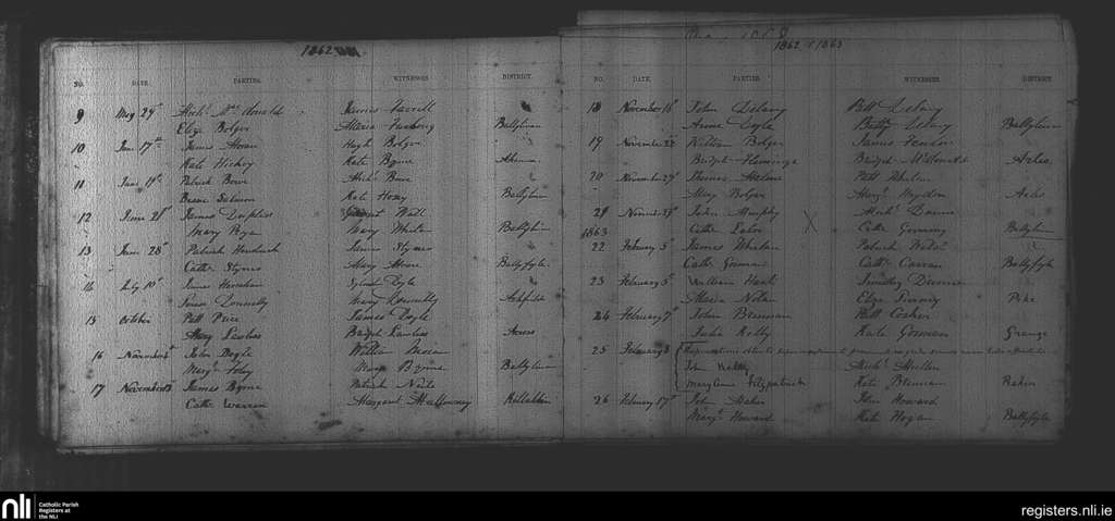 Arles; County of Laois; Diocese of Kildare and Leighlin. Marriages, May 1862 to Feb. 1863