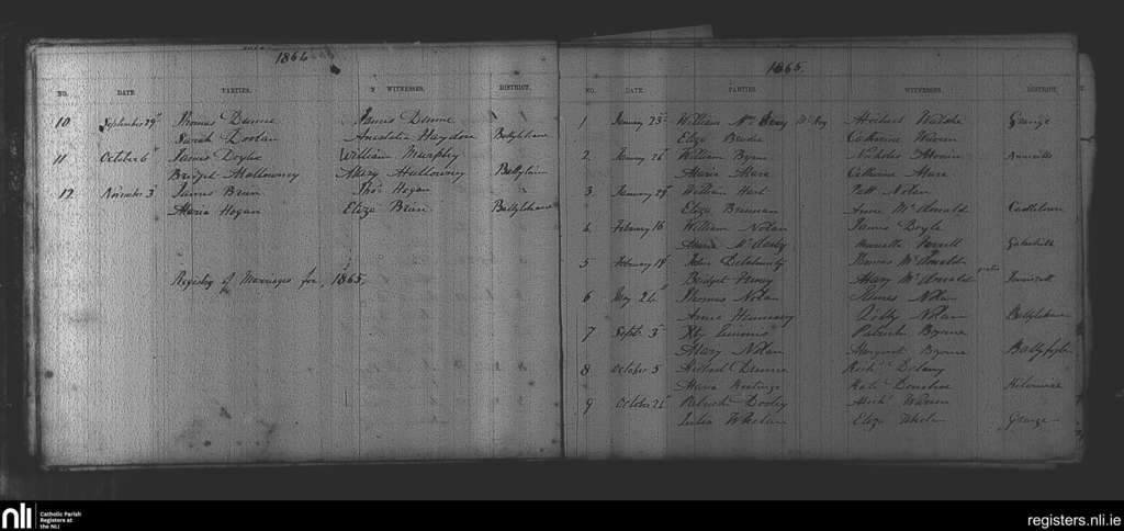 Arles; County of Laois; Diocese of Kildare and Leighlin. Marriages, Sep. 1864 to Oct. 1865