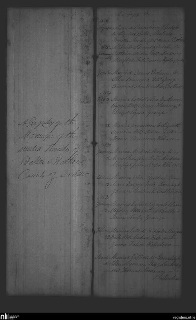 Ballon and Rathoe; County of Carlow; Diocese of Kildare and Leighlin. Marriages, Aug. 1816 to Mar. 1821