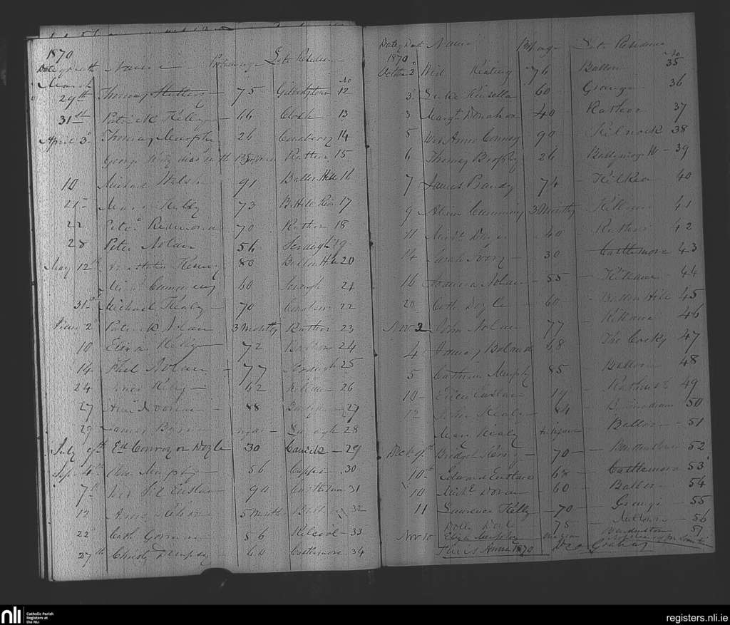 Ballon and Rathoe; County of Carlow; Diocese of Kildare and Leighlin. Deaths, Mar. 1870 to Dec. 1870