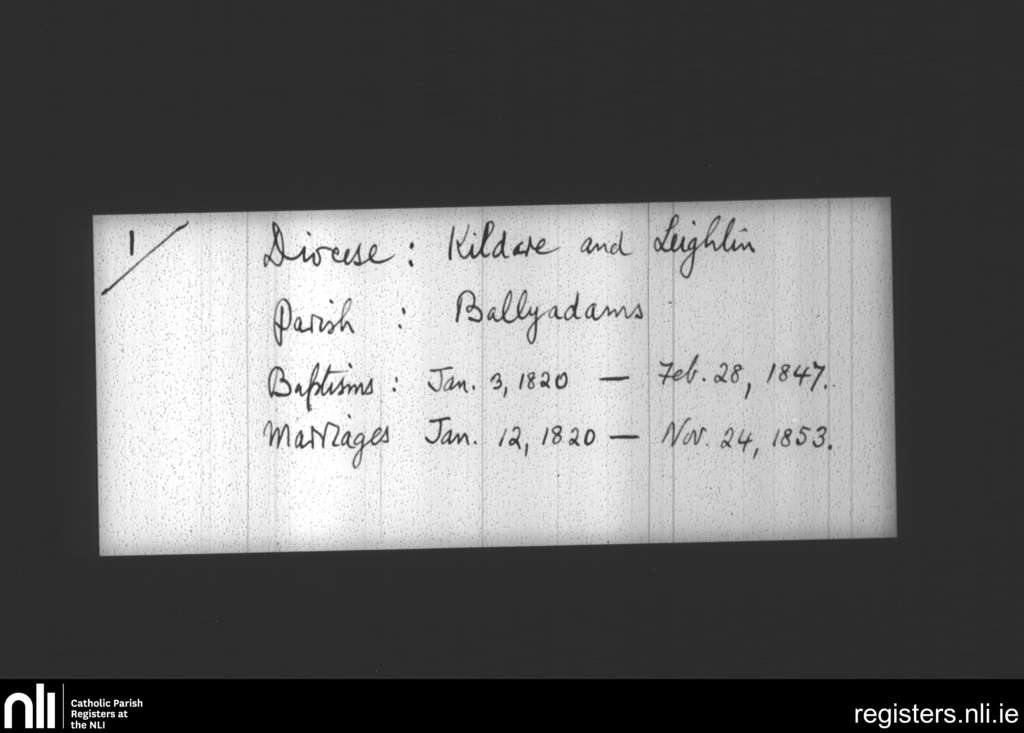 Ballyadams; County of Laois; Diocese of Kildare and Leighlin. Baptisms, Marriages