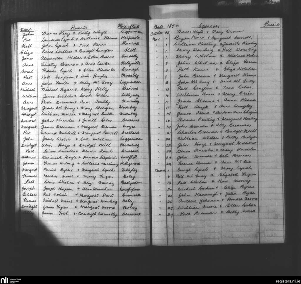 Ballyadams; County of Laois; Diocese of Kildare and Leighlin. Baptisms, Oct. 1846 to Dec. 1846