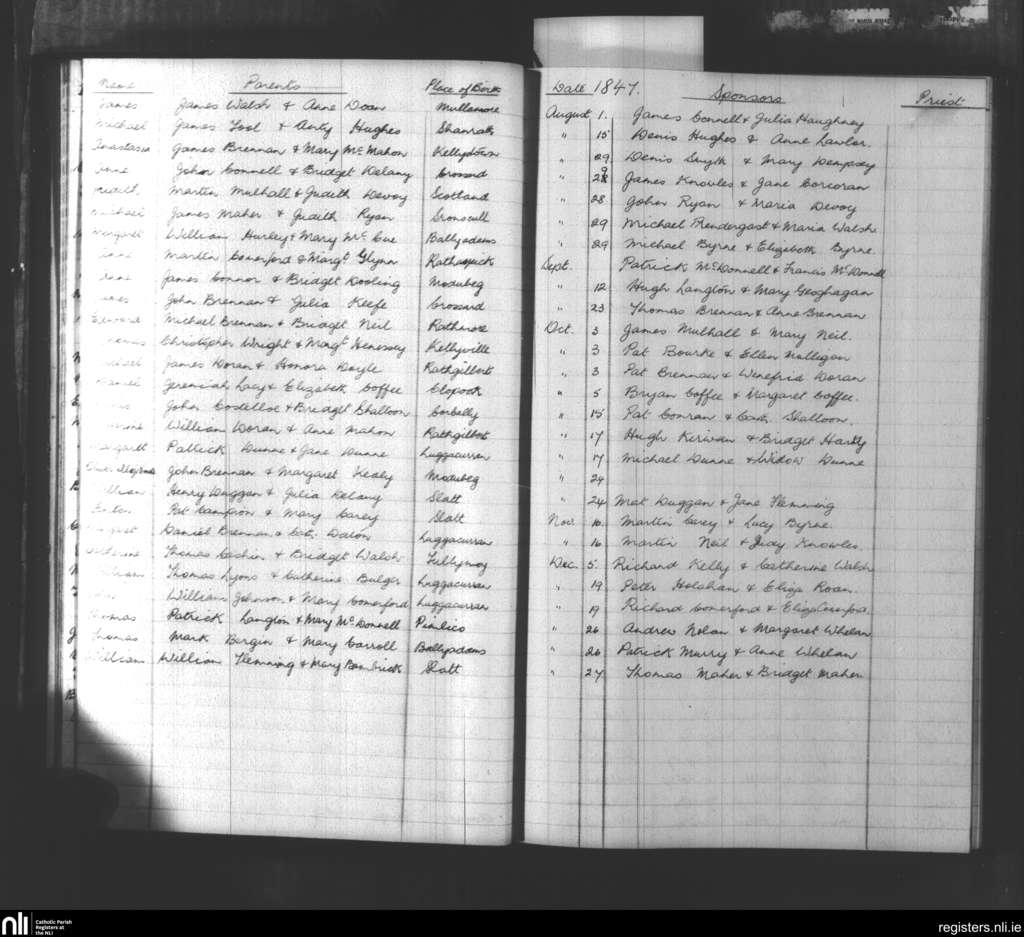 Ballyadams; County of Laois; Diocese of Kildare and Leighlin. Baptisms, Aug. 1847 to Dec. 1847