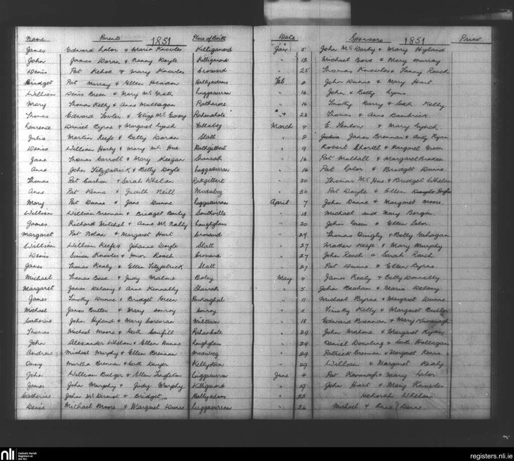 Ballyadams; County of Laois; Diocese of Kildare and Leighlin. Baptisms, Jan. 1851 to June 1851