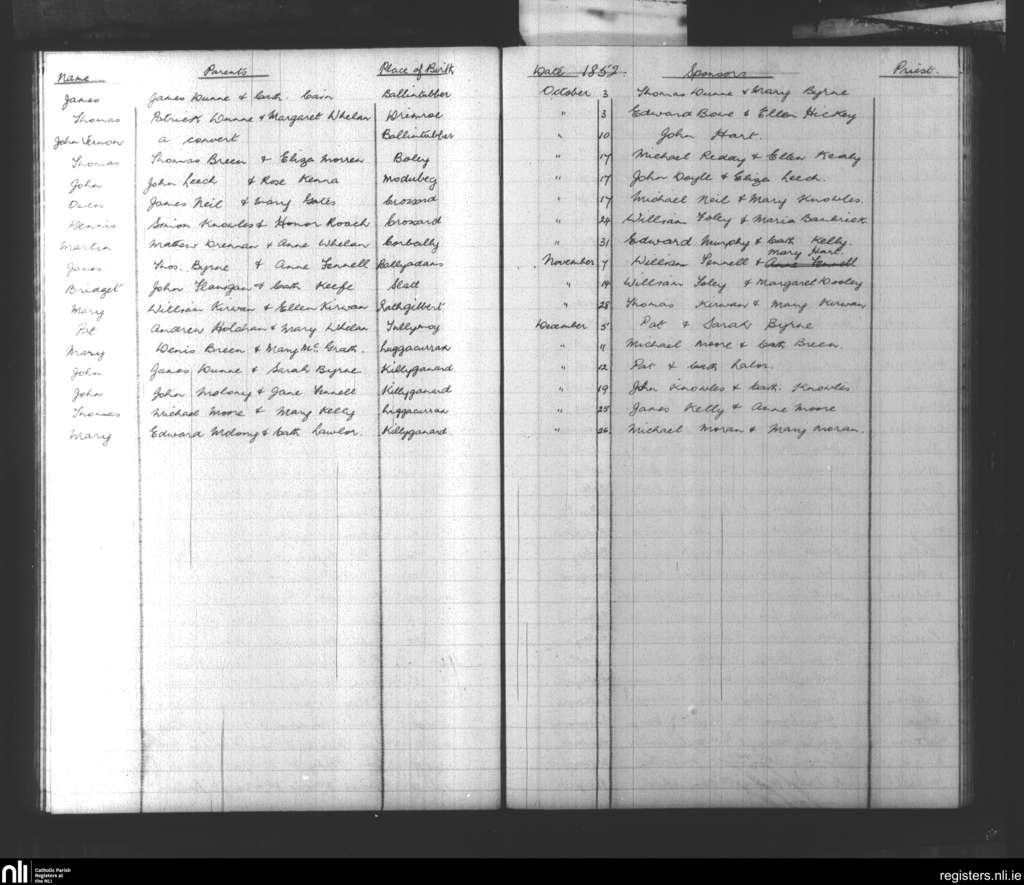 Ballyadams; County of Laois; Diocese of Kildare and Leighlin. Baptisms, Oct. 1852 to Dec. 1852