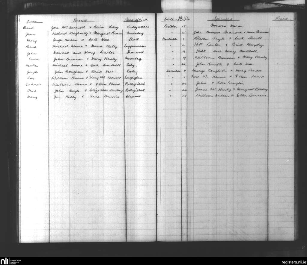 Ballyadams; County of Laois; Diocese of Kildare and Leighlin. Baptisms, Oct. 1854 to Dec. 1854