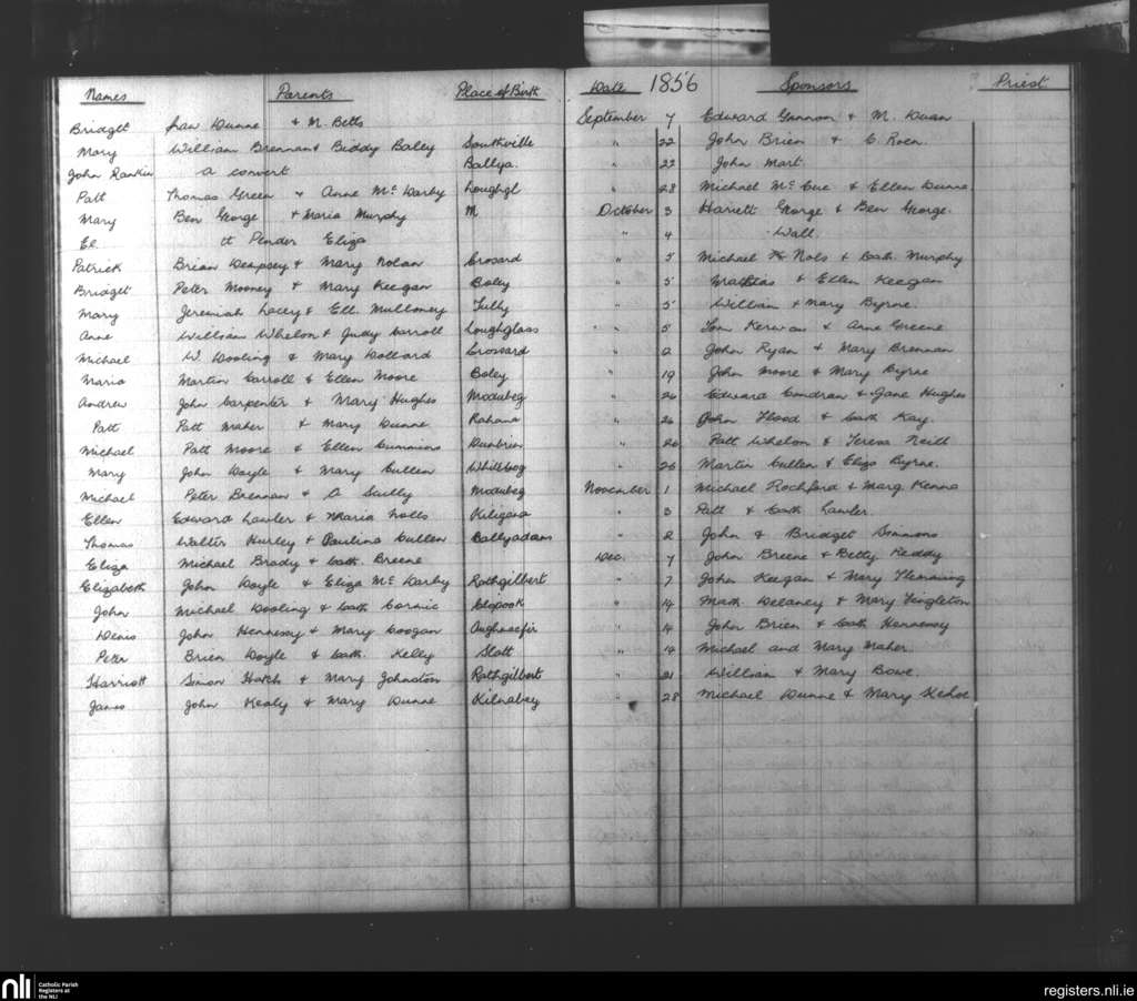 Ballyadams; County of Laois; Diocese of Kildare and Leighlin. Baptisms, Sep. 1856 to Dec. 1856