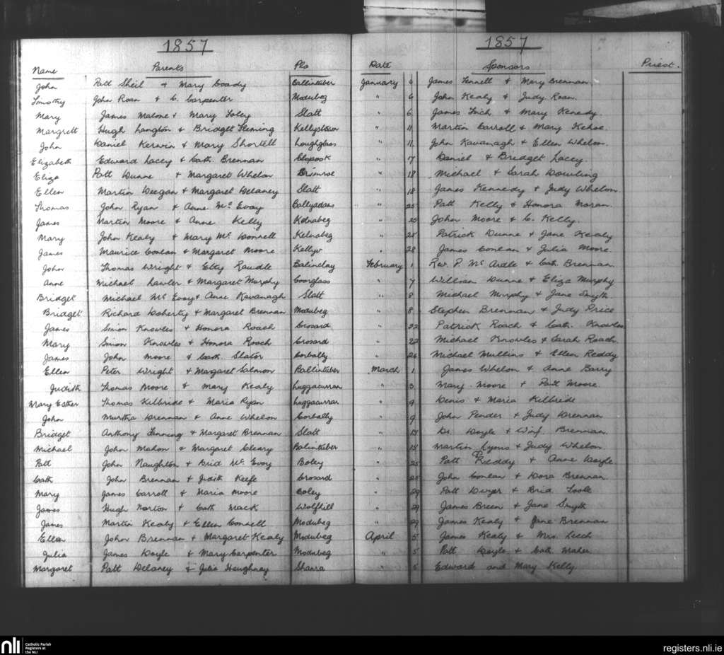 Ballyadams; County of Laois; Diocese of Kildare and Leighlin. Baptisms, Jan. 1857 to Apr. 1857