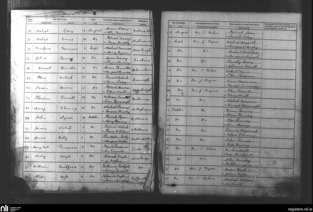 Ballyadams; County of Laois; Diocese of Kildare and Leighlin. Baptisms, Aug. 1874 to Oct. 1874