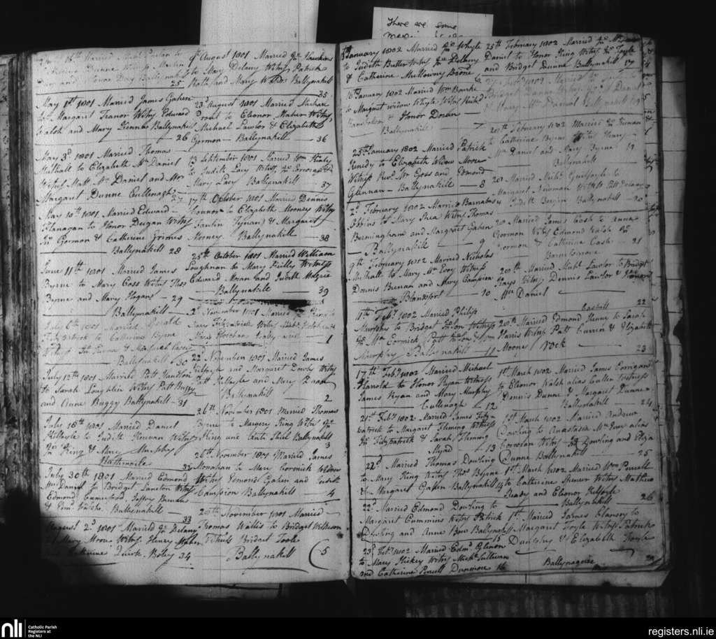Ballynakill; County of Laois; Diocese of Kildare and Leighlin. Marriages, Apr. 1801 to Mar. 1802