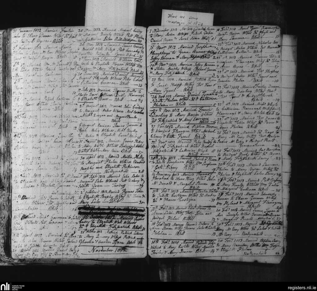 Ballynakill; County of Laois; Diocese of Kildare and Leighlin. Marriages, Jan. 1812 to Feb. 1813