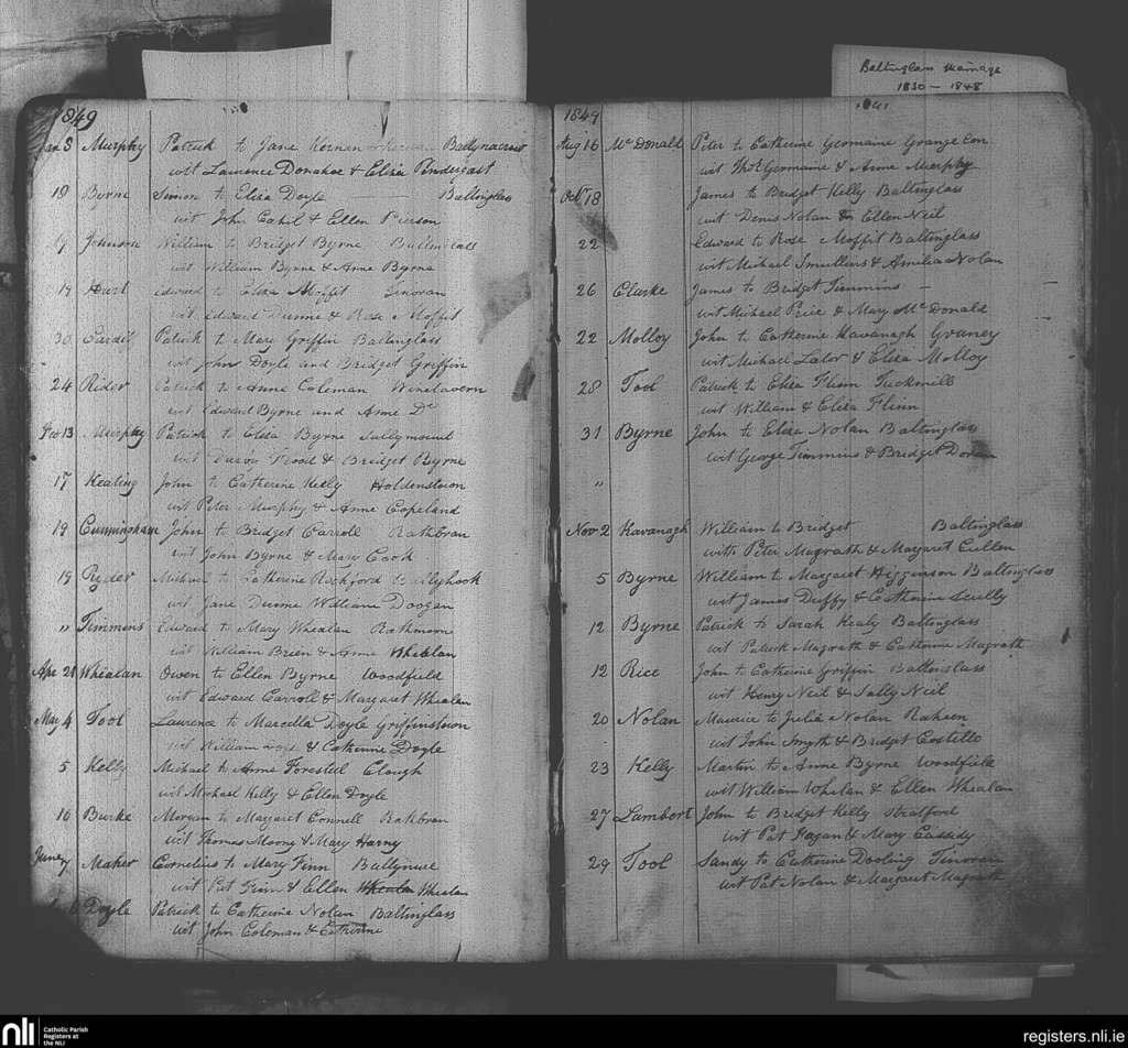 Baltinglass; County of Wicklow, Kildare; Diocese of Kildare and Leighlin. Marriages, Jan. 1849 to Nov. 1849