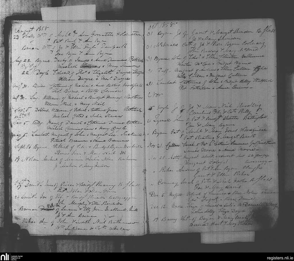 Baltinglass; County of Wicklow, Kildare; Diocese of Kildare and Leighlin. Baptisms, Aug. 1858 to Dec. 1858