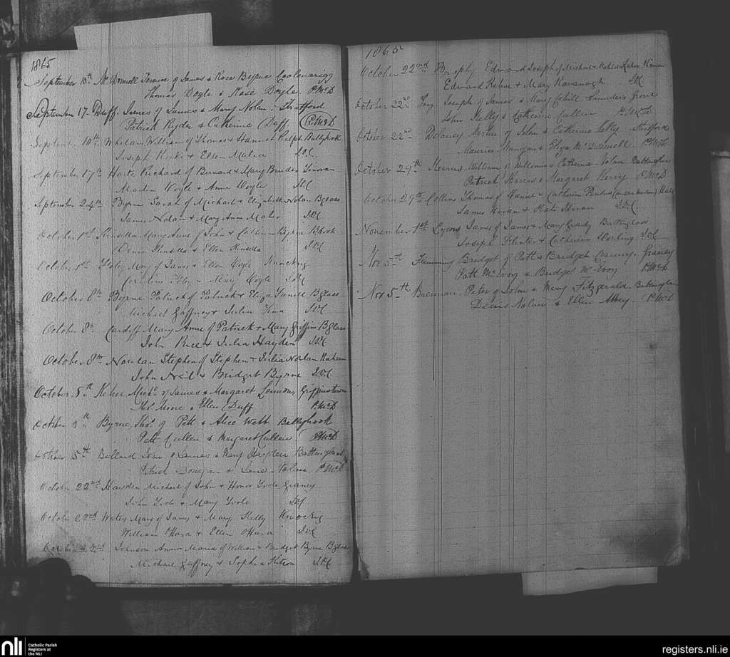 Baltinglass; County of Wicklow, Kildare; Diocese of Kildare and Leighlin. Baptisms, Sep. 1865 to Nov. 1865