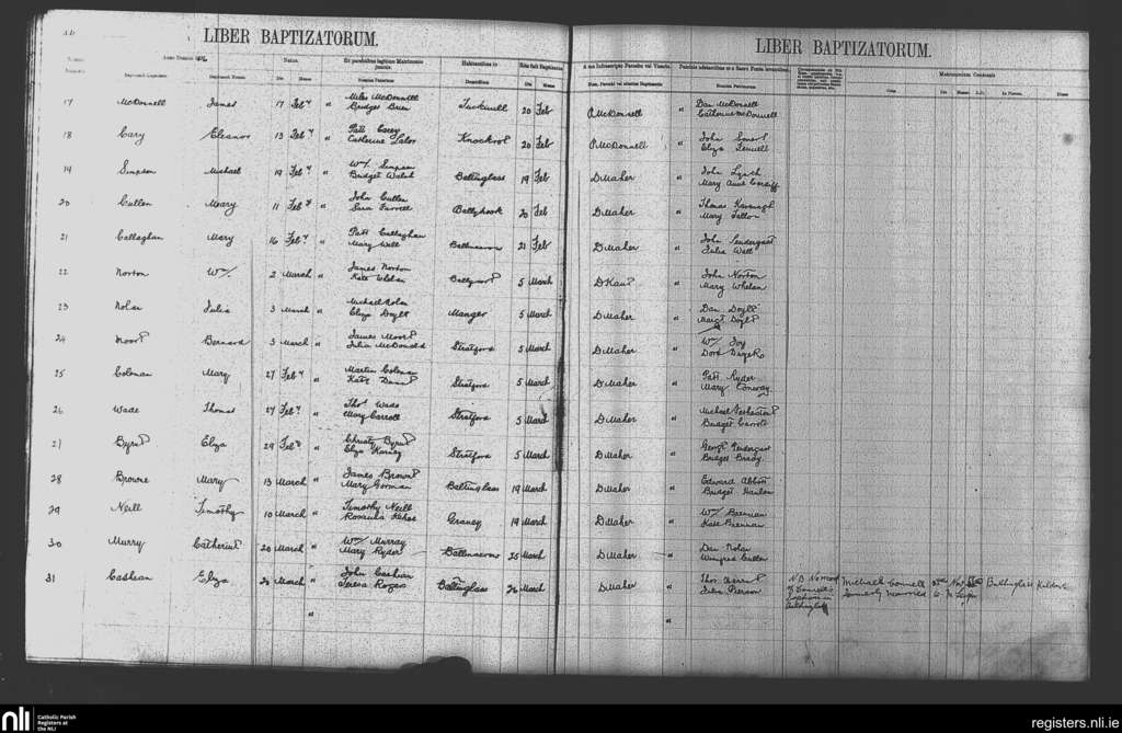 Baltinglass; County of Kildare, Wicklow; Diocese of Kildare and Leighlin. Baptisms, Feb. 1876 to Mar. 1876