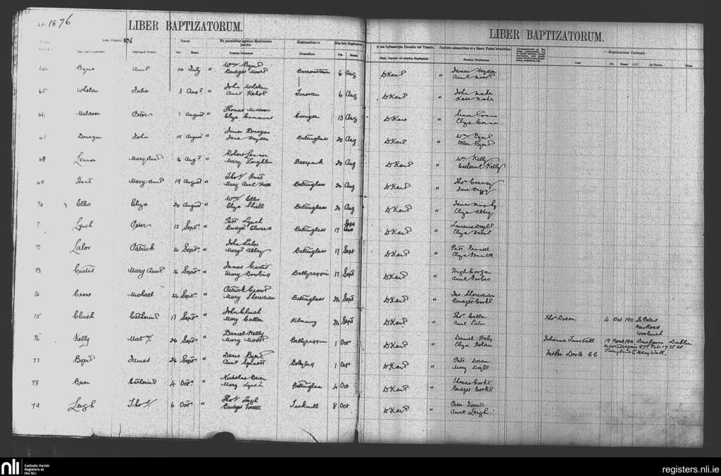 Baltinglass; County of Kildare, Wicklow; Diocese of Kildare and Leighlin. Baptisms, Aug. 1876 to Oct. 1876