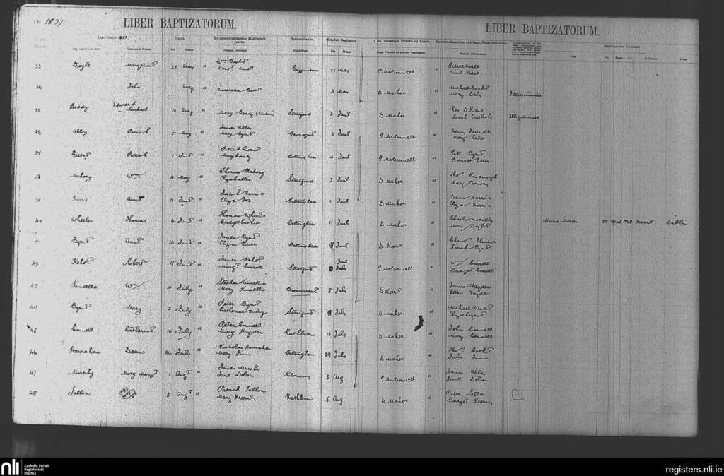 Baltinglass; County of Kildare, Wicklow; Diocese of Kildare and Leighlin. Baptisms, May 1877 to Aug. 1877