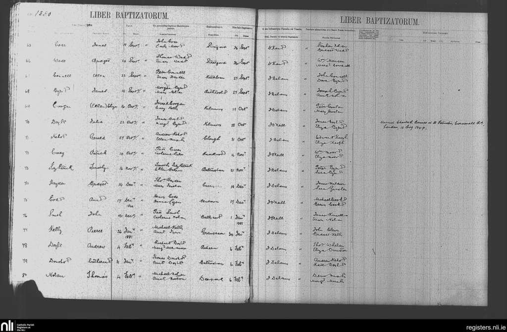 Baltinglass; County of Kildare, Wicklow; Diocese of Kildare and Leighlin. Baptisms, Sep. 1880 to Feb. 1881