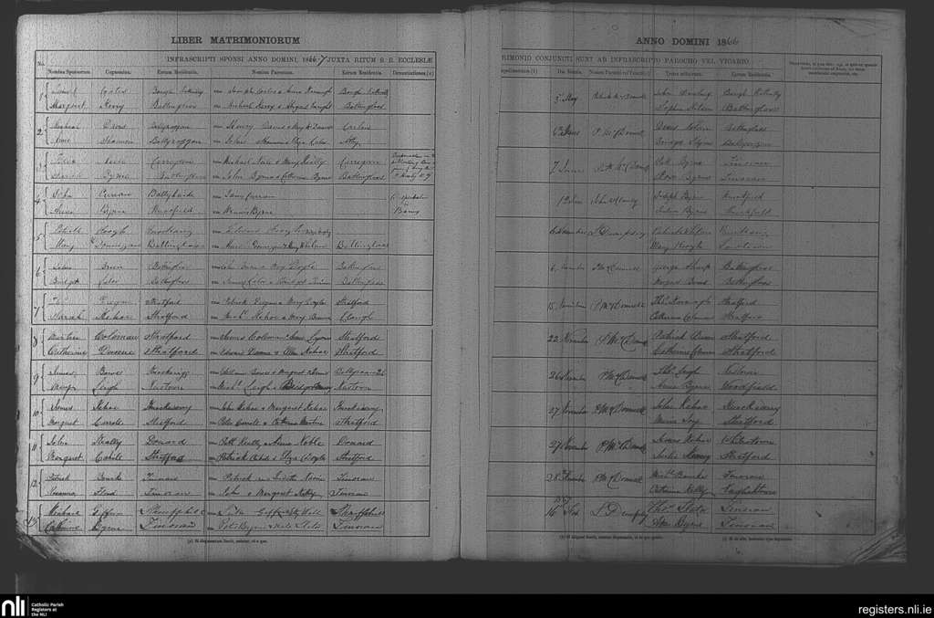 Baltinglass; County of Kildare, Wicklow; Diocese of Kildare and Leighlin. Marriages, May 1866 to Feb. 1867